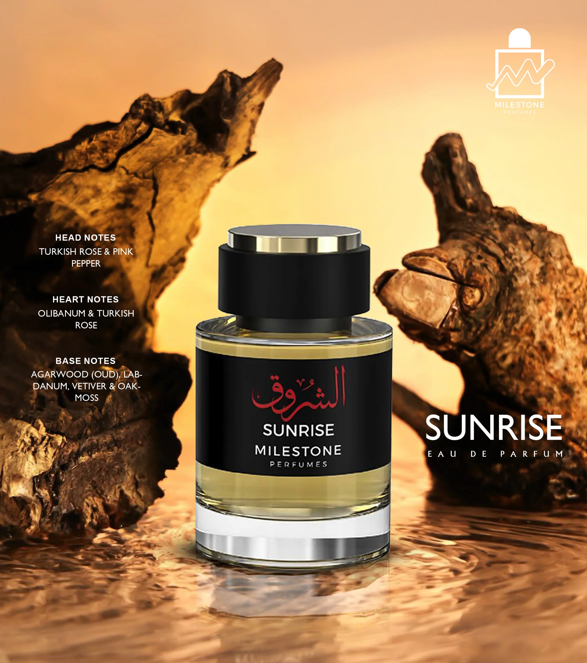 Sunrise marki Milestone to orzeźwiający zapach unisex, który łączy w sobie nuty korzenne, kwiatowe i drzewne. Nutami głowy są róża turecka i różowy pieprz, które zapewniają żywe i eleganckie otwarcie. Serce zawiera olibanum (kadzidło), które zapewnia ciepłą i żywiczną głębię. Nuty bazy: wetyweria, drzewo agarowe (oud), labdanum i mech dębowy nadają zapachowi długotrwałe, wyrafinowane wykończenie.